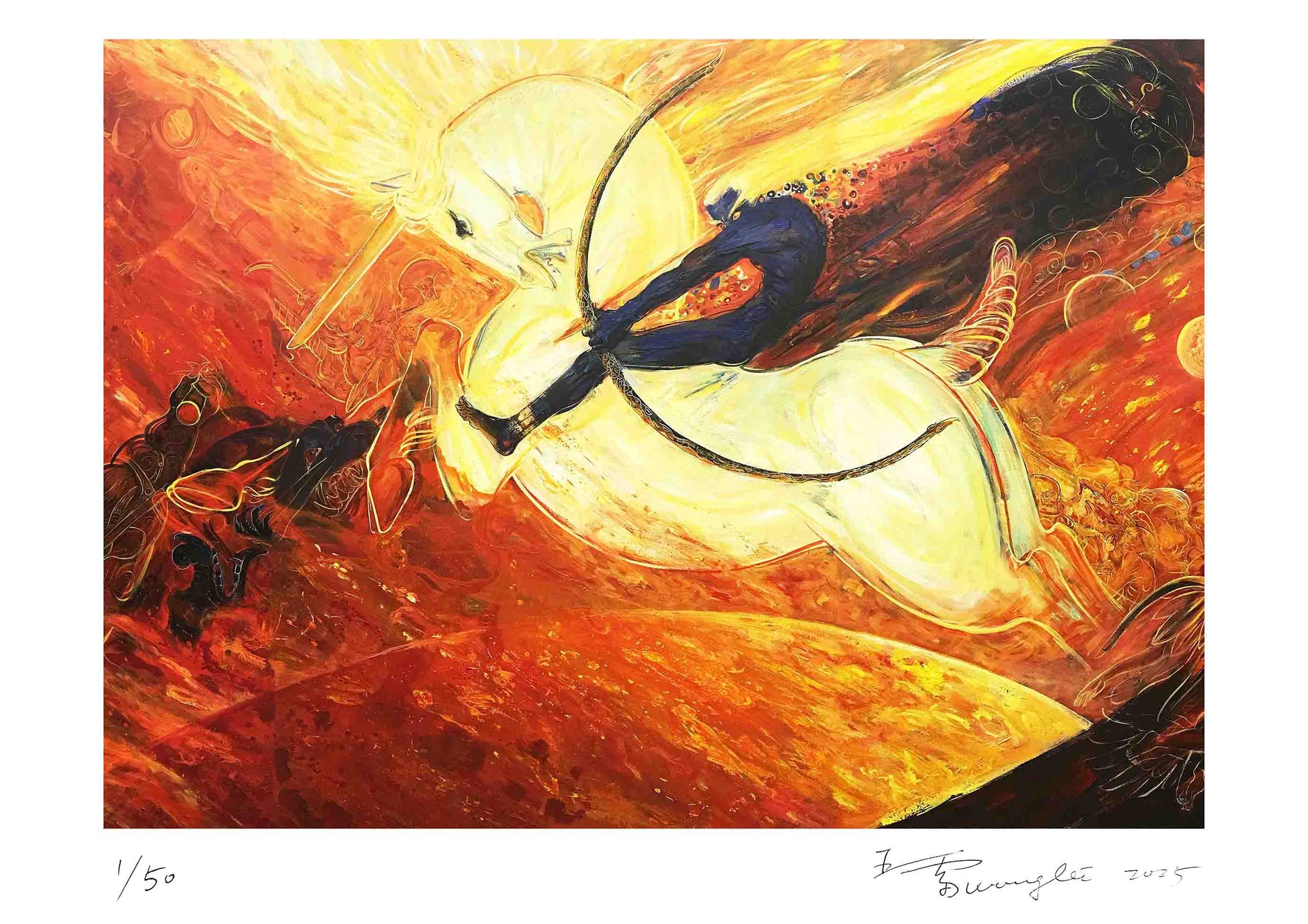在中國神話中,「後羿射日」的故事家喻戶曉。我在創作太陽神東君時,借用了這個神話的形象,把東君描繪成騎在麒麟背上,彎弓射天狼(天狼)的太陽神。
