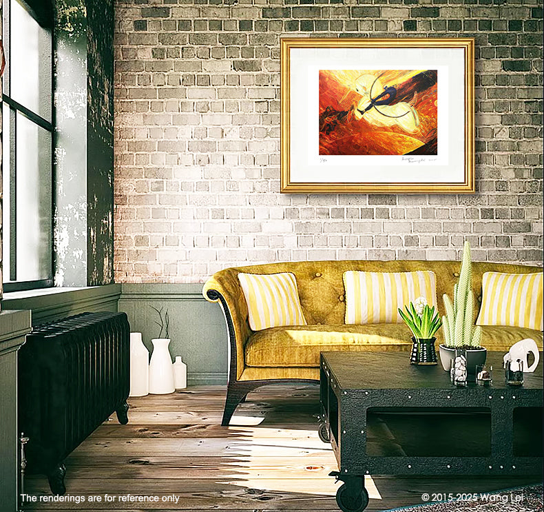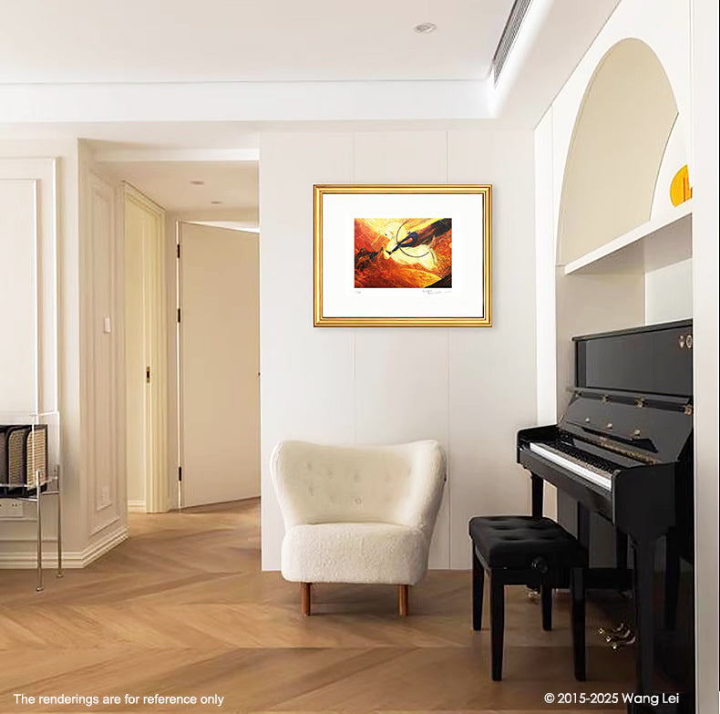 「麒麟」是我一直喜愛並長期創作的主題形象。其獨角獸姿態與西方神話中的「獨角獸」十分相似。在西方神話中,「獨角獸」象徵正直、純潔和無畏,只陪伴處女。在中國道教的詮釋中,「麒麟」象徵著純陽之神,與太陽神的主題不謀而合。